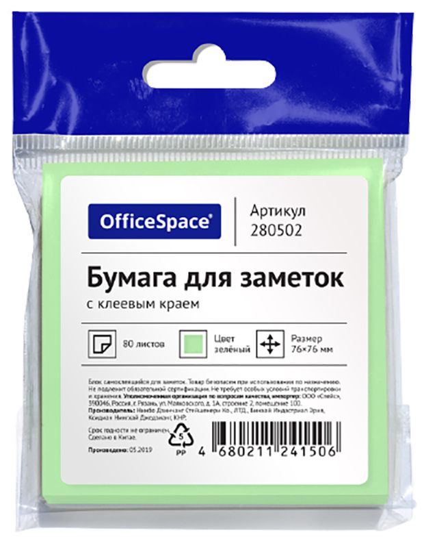 OfficeSpace Блок самоклеящийся 76х76 мм, 80 листов зелeный