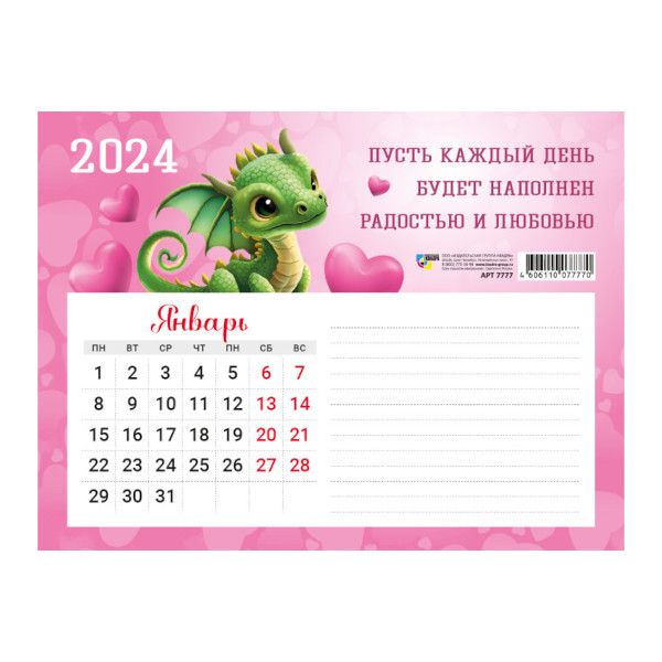 Календарь с блоком для записей 2024 символ года дракон
