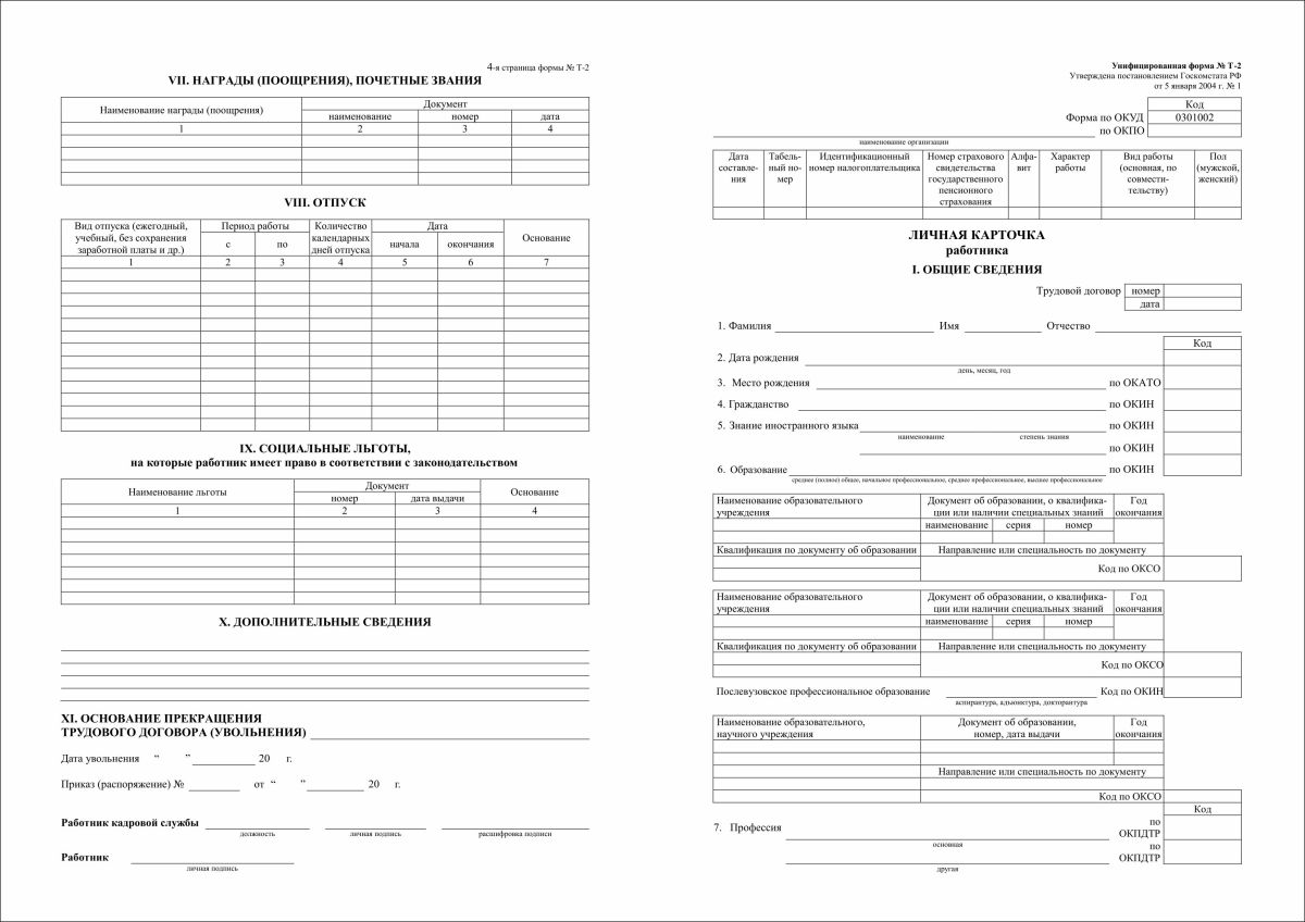 Личная карточка работника форма Т2