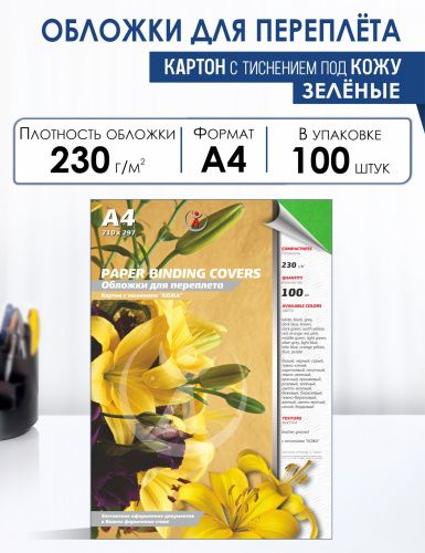 Обложки для переплета картонные, текстура кожа, 230г/м2, А4, зеленый