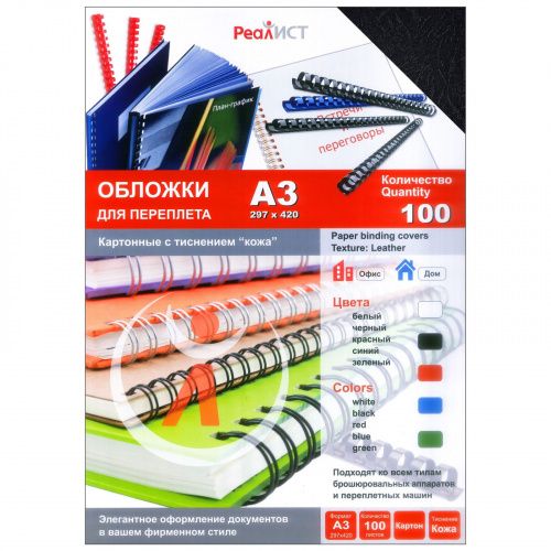 Обложки для переплета картонные, текстура кожа, А3, черный