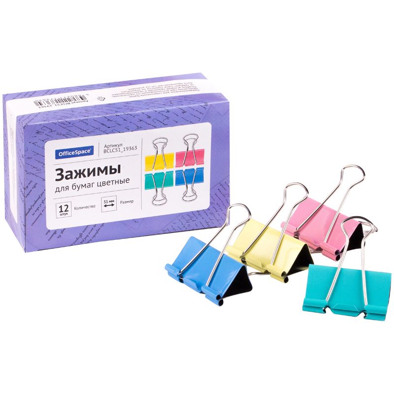 Зажимы для бумаг 51мм, OfficeSpace, 12шт., цветные, картонная коробка